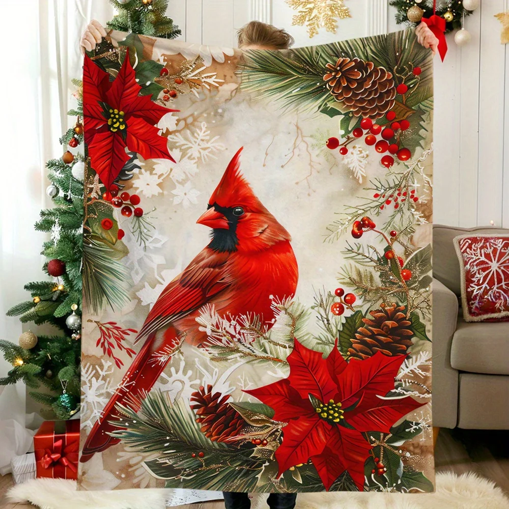 "Christmas Cardinal Blanket with Poinsettia and Pinecones, Festive Holiday Decor for Home, Perfect Gift for Winter Season"